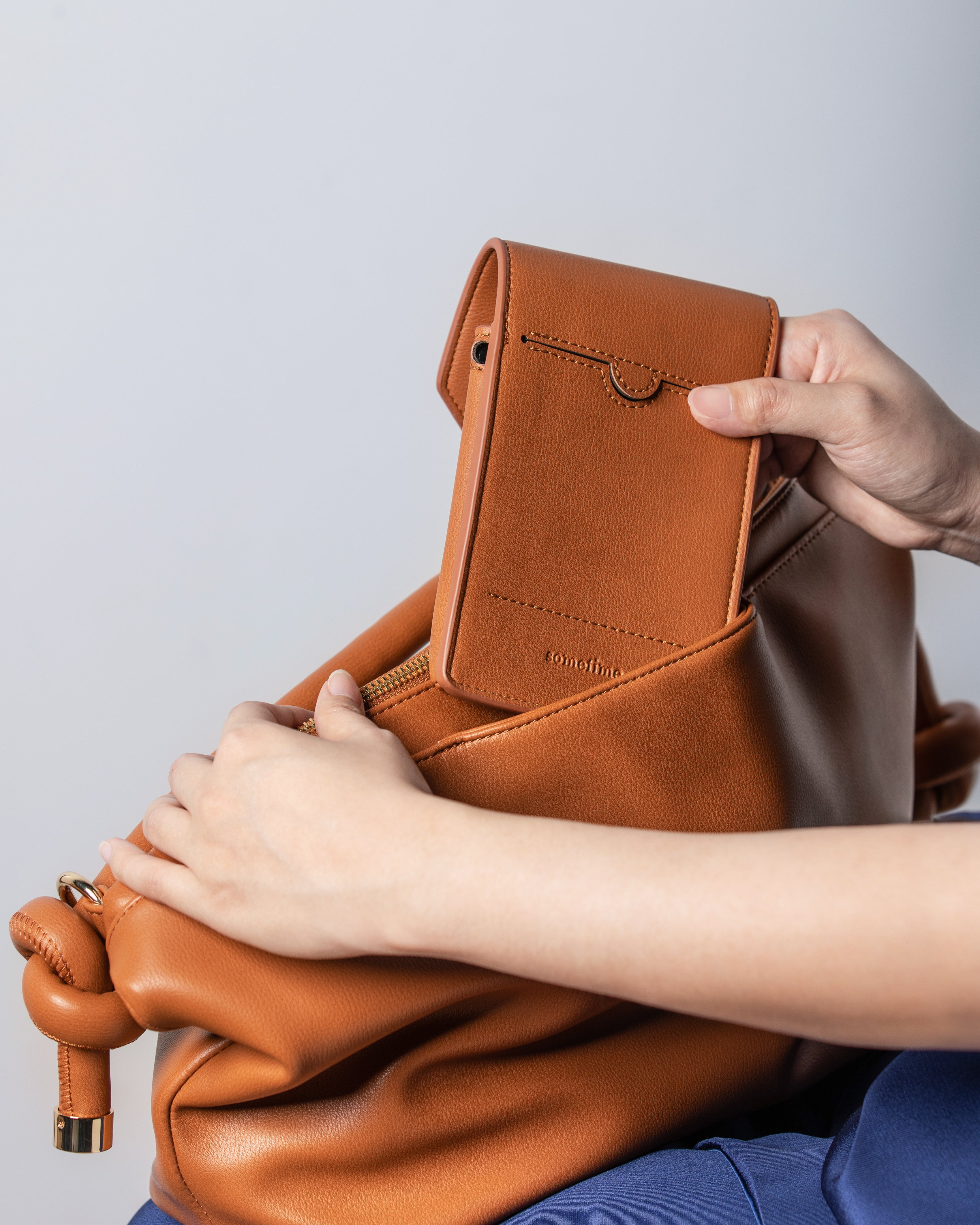 The Basta 3 accentuates a soft silhouette and boasts a spacious compartment. Its signature flap design is removable and can be worn as a phone bag on its own.