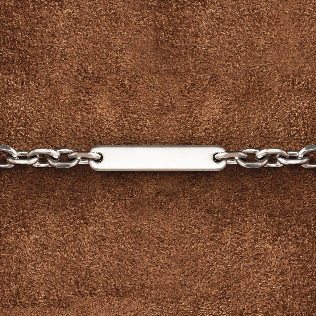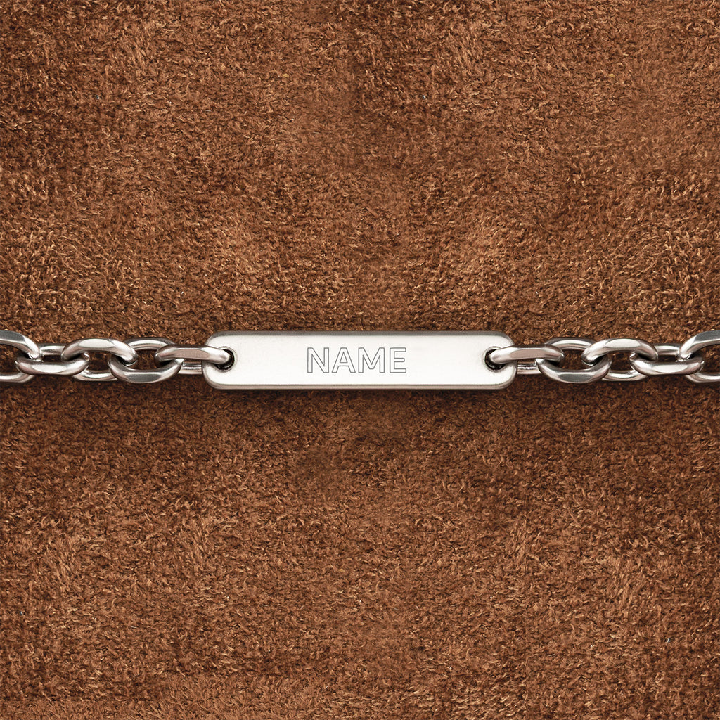 The metal chain features a seashell, mermaid tail and a starfish, along with a customizable plate for up to six engraved block letters.